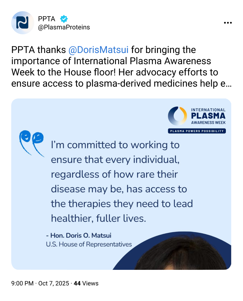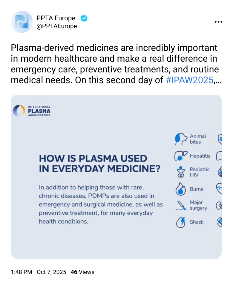 Post content to your social media accounts acknowledging IPAW. Share and like PPTA's Facebook, Twitter, or LinkedIn posts @PPTAEurope and @PlasmaProteins. Don’t forget to use the official IPAW hashtag in your social media content: #IPAW2025.