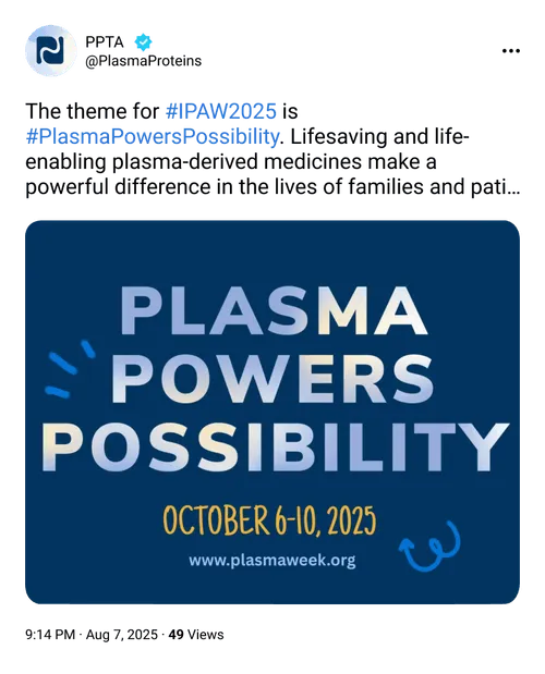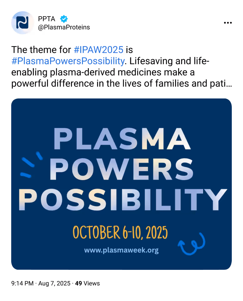 Post about #IPAW2025 on your favourite social media platforms to raise awareness about plasma donation and the power of plasma-derived therapies. Get started right away with a pre-scripted tweet for X (Twitter), (Note: You must be logged into Twitter for the text to populate.) or find more content with a social media toolkit.